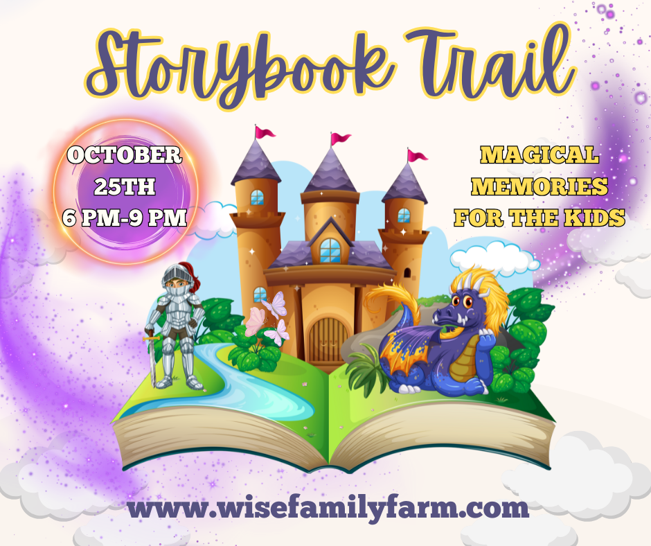 Come out and enjoy the farm and all it has to offer during the day for 14.95 and Storybook Trail is included. However, if you just want to come for the Storybook Trail, admission is 12.95. You can bring your child’s costume that day and do a quick change and then meet us at the wagon pick up to travel down to storybook trail. This will be a trick or treat experience that you and your child will want to make a tradition. Your child will travel through the woods trick- or- treating to various story book characters while you are capturing those much cherished pictures. Once finished traveling through the woods, a wagon will load you back up and bring to the top of the farm. What a fun sweet treat to end the day at Wise Family Farm. This event is no additional price to the general admission for the pumpkin patch. If you can’t spend the whole day with us and want to just come for Storybook Trail you are more than welcome and will pay a reduced ticket price of $12.95.