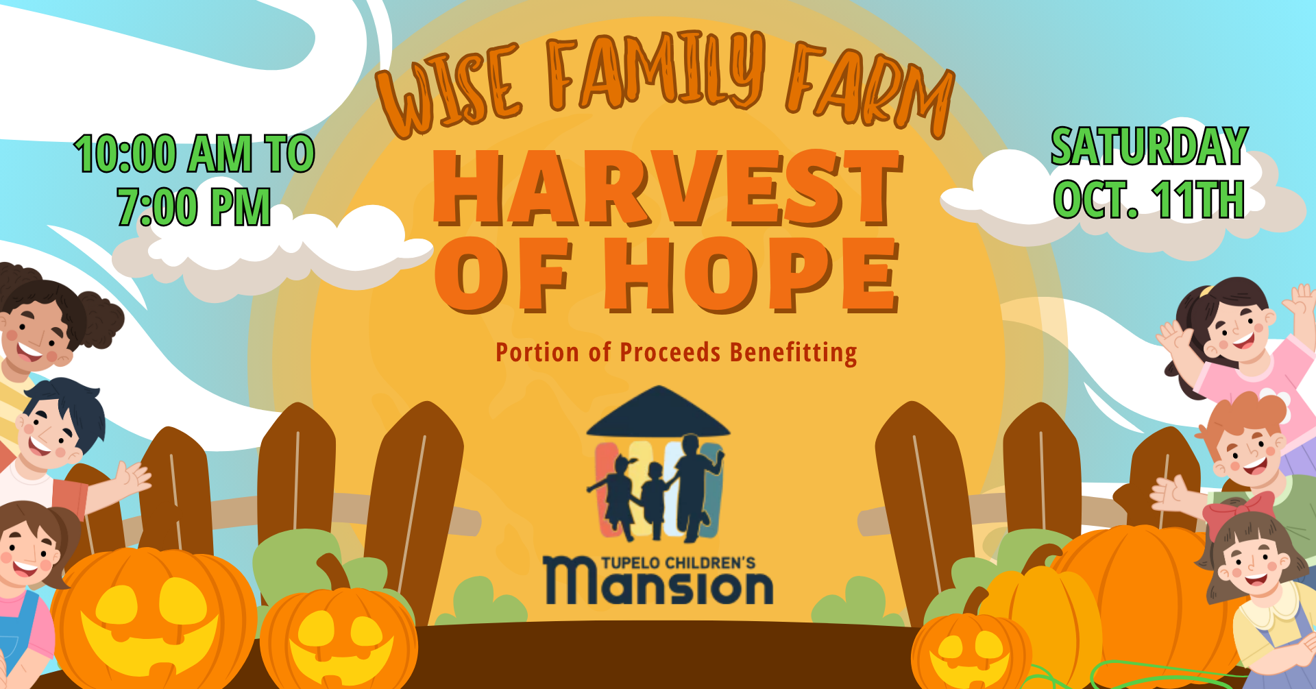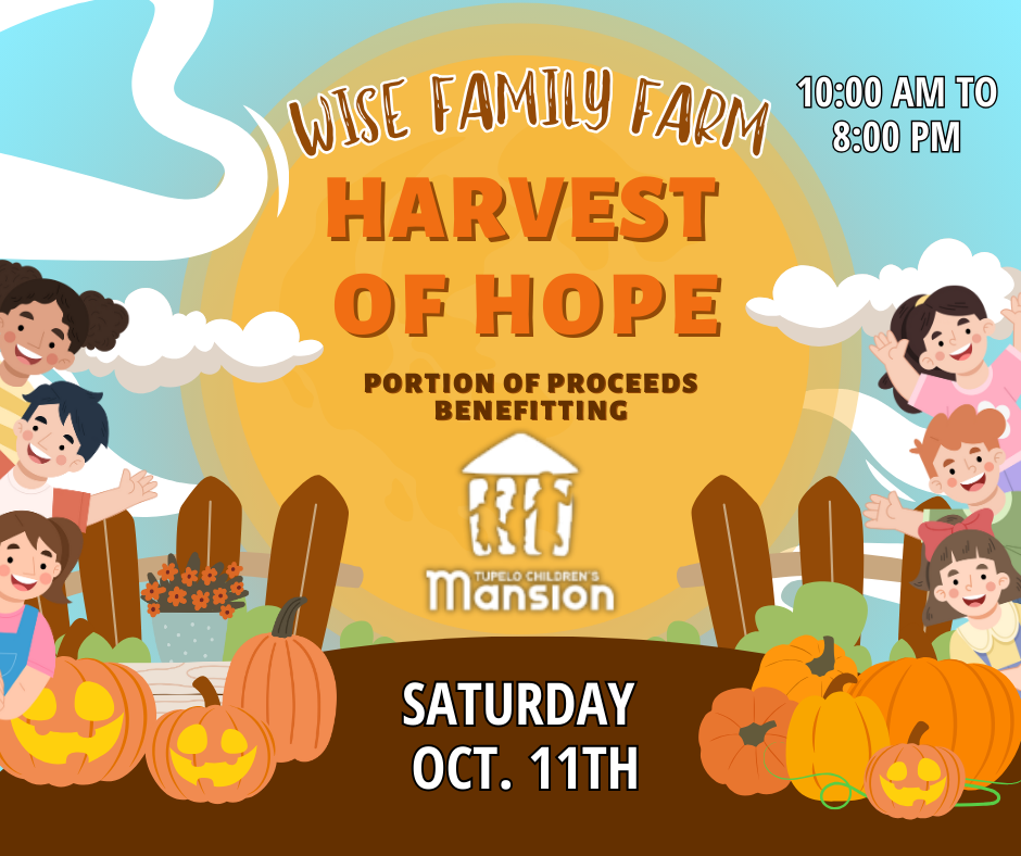 You’re Invited! Bring your family & friends for a day of fun, laughter, and memories at Wise Family Farm. Enjoy all the exciting activities on the farm- while supporting a great cause- Tupelo Children’s Mansion. A portion of proceeds from this day will benefit this wonderful organization to help them provide care and support for children in need.