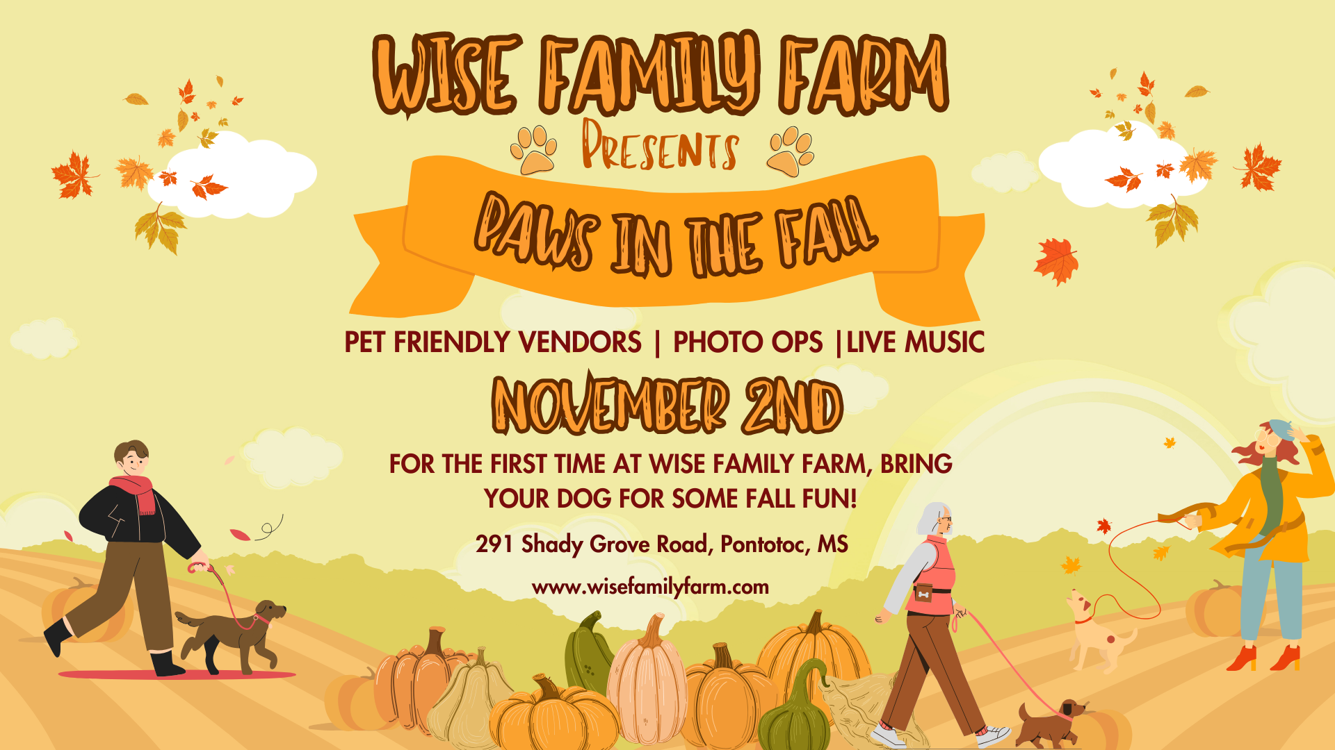 For the first time at Wise Family Farm, we are inviting our guests to bring their dogs to the farm (yes, don’t worry- your four-legged friends get in free)! We will have pet friendly vendors set up if you want to treat your beloved pup. There will be plenty of photo ops to capture the day. Dogs must be friendly and up to date on rabies vaccine per Mississippi law. Please bring poop bags and clean up after your pet!